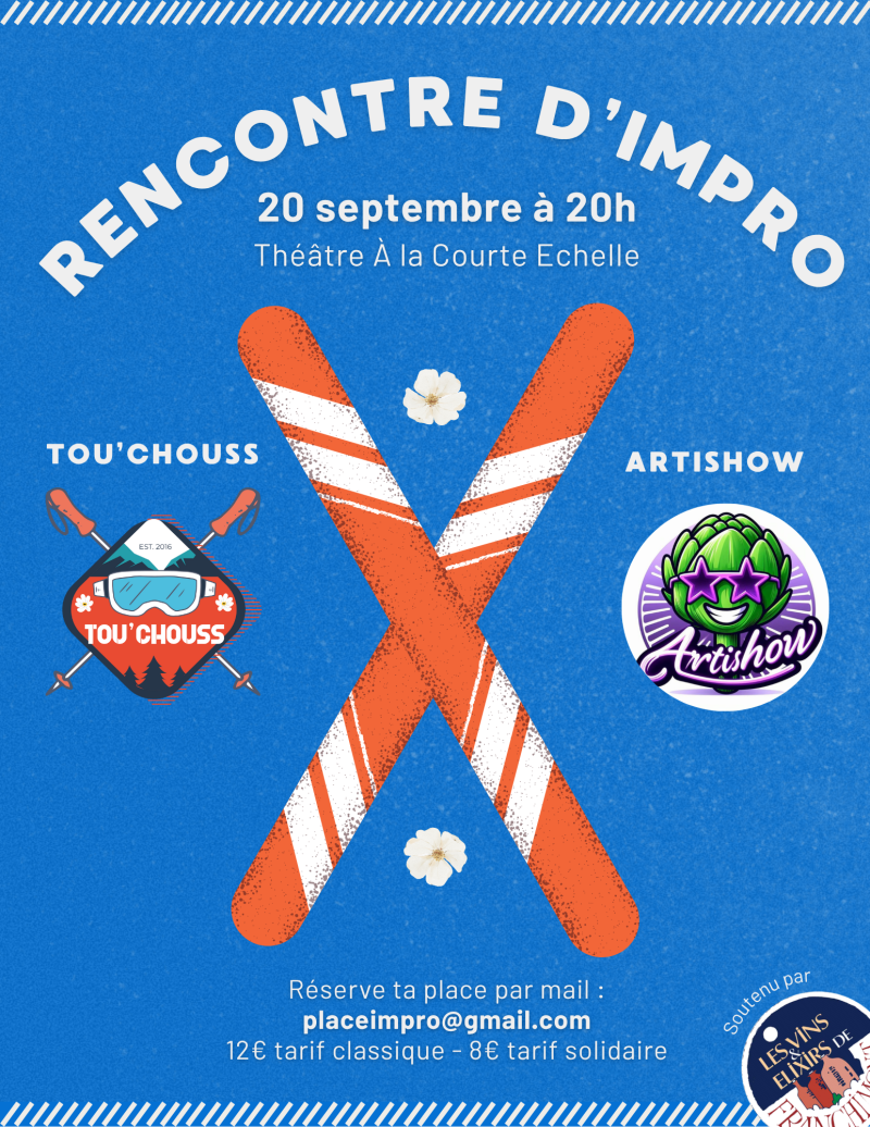 C'est la rencontre d'improvisation de la rentrée ! Les Tou'chouss reçoivent les Artishow. Deux équipes de Liège vont s'affronter sous l'œil démoniaque d'un arbitre de talent. Du fun, des surprises, de l'amour et des créations spontanées !